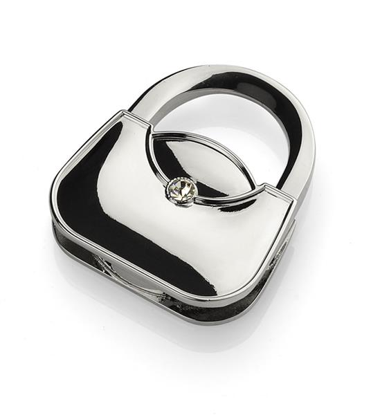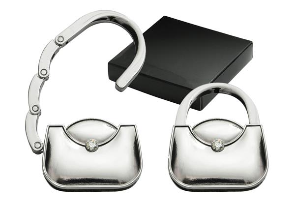 Składany wieszak na torebkę w kształcie damskiej torebki wykonany z metalu. Wieszak ozdobiony szkiełkiem zapewniającym mu elegancki wygląd. Pakowany w czarne pudełeczko. Na powierzchni wieszaka wykonujemy znakowanie grawerem.