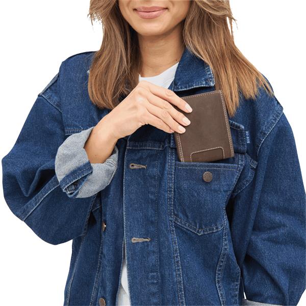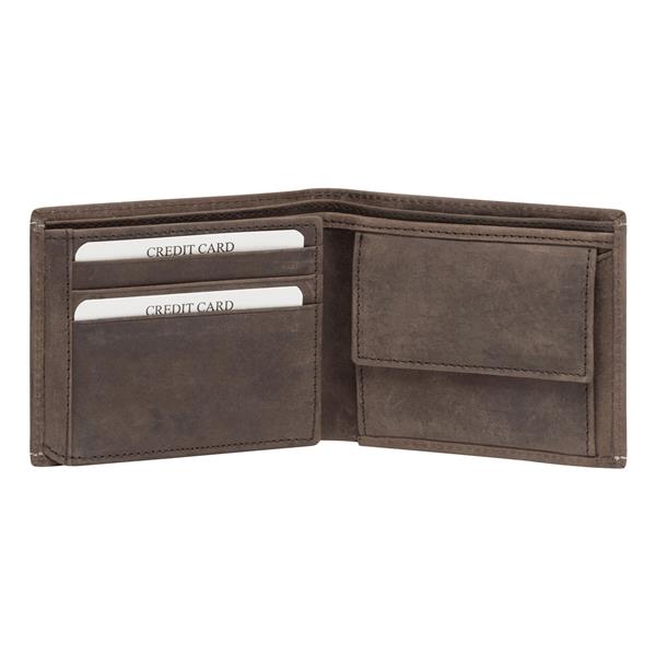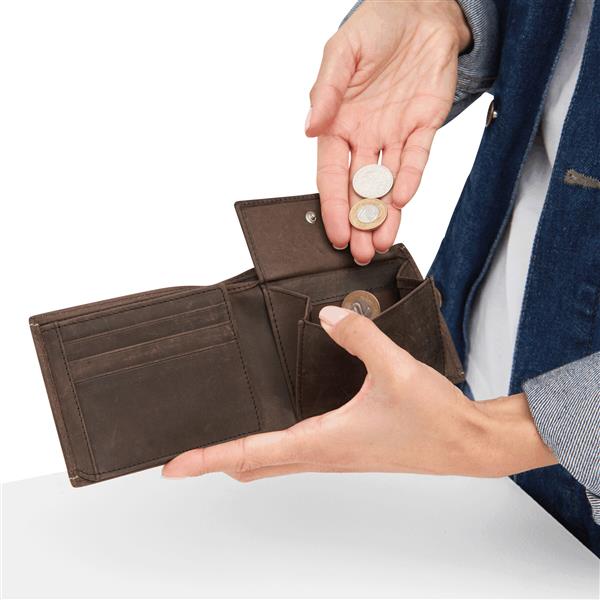 Skórzana portmonetka WILD STYLE I, 6 wsuwanych kieszonek na karty, 2 kieszonki na banknoty, 1 kieszonka na monety z zatrzaskiem, 1 kieszonka z siatki na dokument tożsamości lub prawo jazdy.