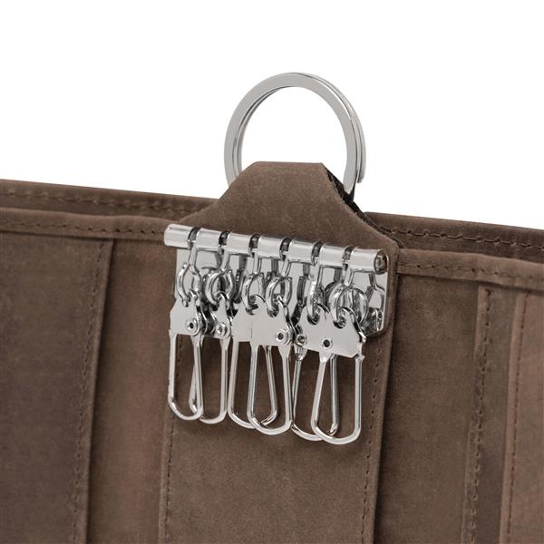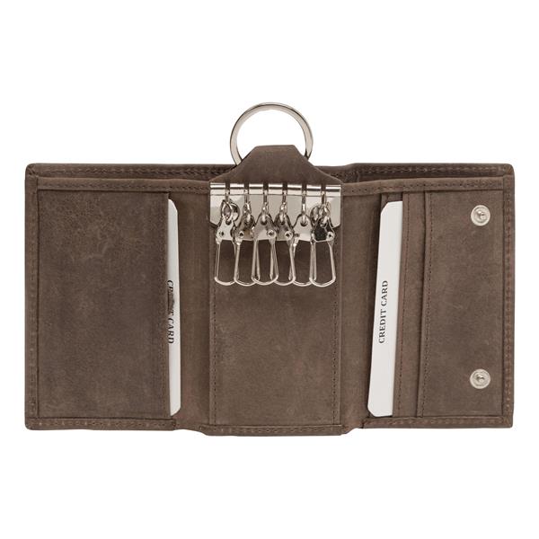 Skórzane etui na klucze WILD STYLE III, 1 duże kółko na najczęściej używany klucz, 6 małych zapinek na pozostałe klucze, 4 wsuwane kieszonki na karty kredytowe i wizytówki, 1 przegroda na banknoty, 2 zapięcia na zatrzask.