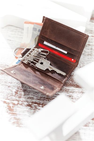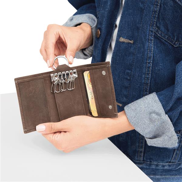 Skórzane etui na klucze WILD STYLE III, 1 duże kółko na najczęściej używany klucz, 6 małych zapinek na pozostałe klucze, 4 wsuwane kieszonki na karty kredytowe i wizytówki, 1 przegroda na banknoty, 2 zapięcia na zatrzask. Materiał: Skóra Kolor: brązowy Tagi: portfele,portmonetki,portmonetki,breloczki/smycze,skóra