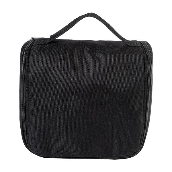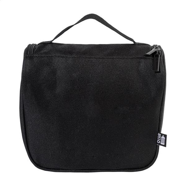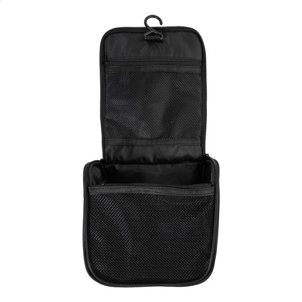Wisząca kosmetyczka z tworzywa RPET z przegródkami zapinanymi na suwak i kieszeniami z siatki. Poliester 600D RPET, z charakterystyczną metką RPET.