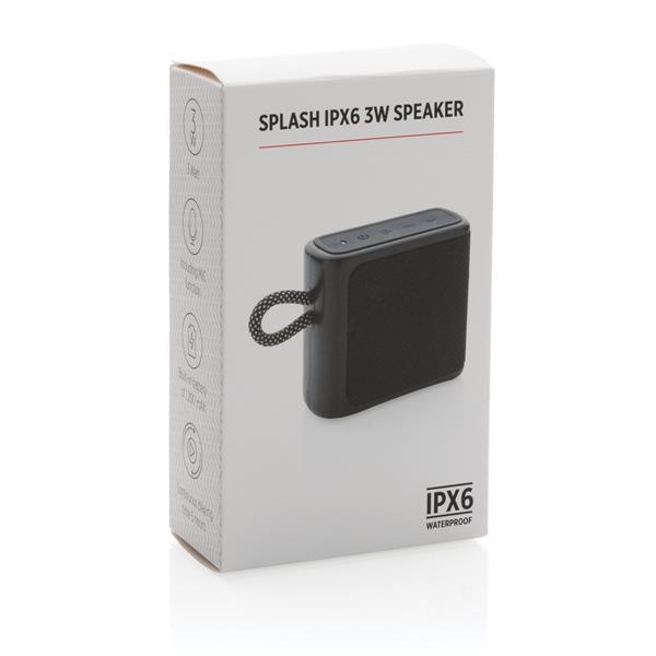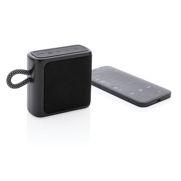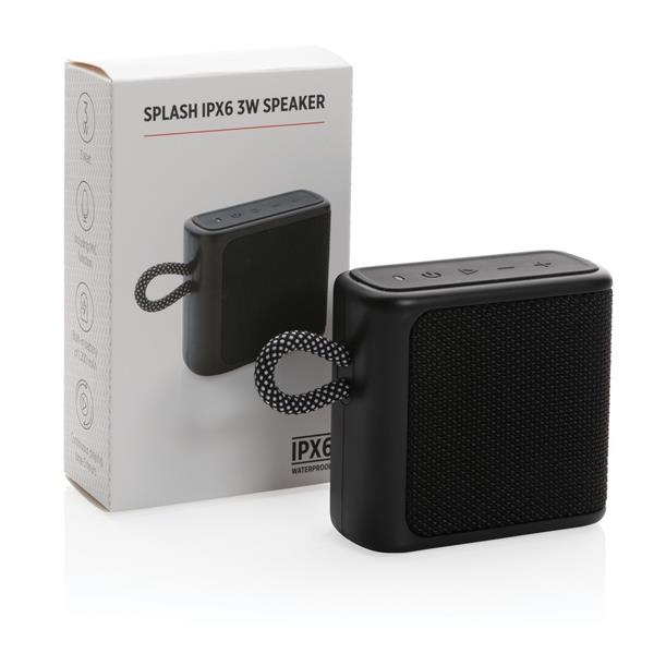 Głośnik bezprzewodowy 3W, BT 5.1, wodoodporny IPX6 (całkowite zabezpieczenie przed strumieniem wody płynącej z różnych kierunków z wydajnością do 100 litrów na minutę), wykonany z ABS i tkaniny, mikrofon, funkcja odbierania połączeń, wbudowany akumulator o pojemności 1200 mAh umożliwia odtwarzanie muzyki do 5 godzin, ponowne naładowanie w 3 godziny, zasięg do 10 m, kabel USB typu C w komplecie, ślad węglowy produktu: 2,26 kg CO2