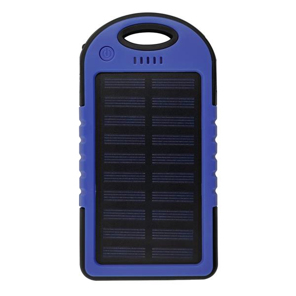 Wodoodporny power bank 4000 mAh z panelem słonecznym do ponownego ładowania power banku, przycisk on/off, lampka, 4 diody LED wskazujące poziom naładowania elektrycznego, 1 dioda LED wskazująca poziom naładowania słonecznego, 2 wyjścia USB, możliwość ładowania dwóch urządzeń jednocześnie, wejście 5V/1A, wyjście 1: 5V/1A, wyjście 2: 5V/1A, kabel micro USB oraz karabińczyk w komplecie