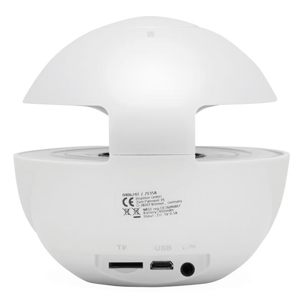 Głośnik bezprzewodowy WONDER BALL MINI zmieniający kolory podczas odtwarzania. Wyjście muzyczne 3 W. Do łączenia z urządzeniami obsługującymi technologię bezprzewodową, zasięg ok. 10 m, może być podłączony do innych urządzeń zewnętrznych poprzez 3,5 mm liniowe gniazdo audio (długość kabla ok. 53 cm). Gniazdo kart microSD, funkcja głośnomówiąca, zakres częstotliwości 20 Hz – 20 KHz, akumulator o pojemności ok. 400 mAh, czas pracy ok. 4 godzin, kabel ładujący USB z wtyczką Micro-USB (długość ok. 53 cm), czas ładowania ok. 4 h, przyciski sterujące na górze, przełącznik zasilania, powłoka antypoślizgowa na spodzie.