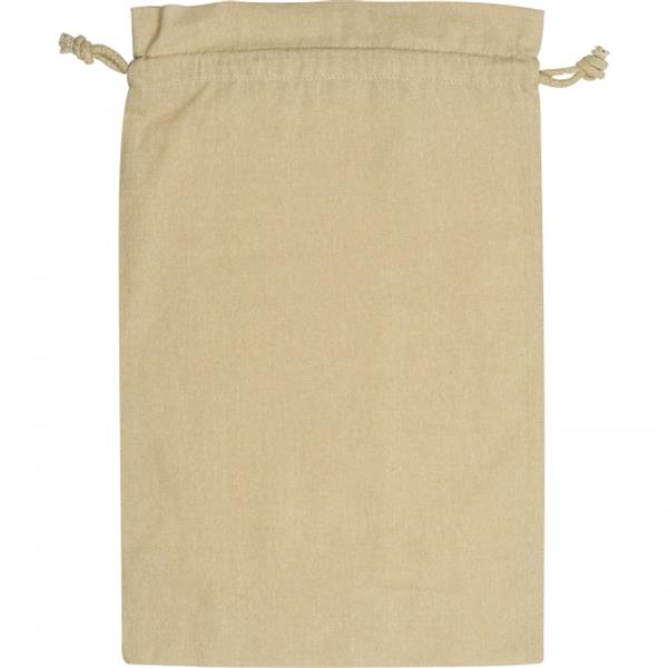 Duży woreczek bawełniany wykonany z bawełny pochodzącej z recyklingu, z certfikatem Oeko-Tex STANDARD 100, gramatura 110g/m2. Woreczek zamykany za pomocą sznureczków ściągających.