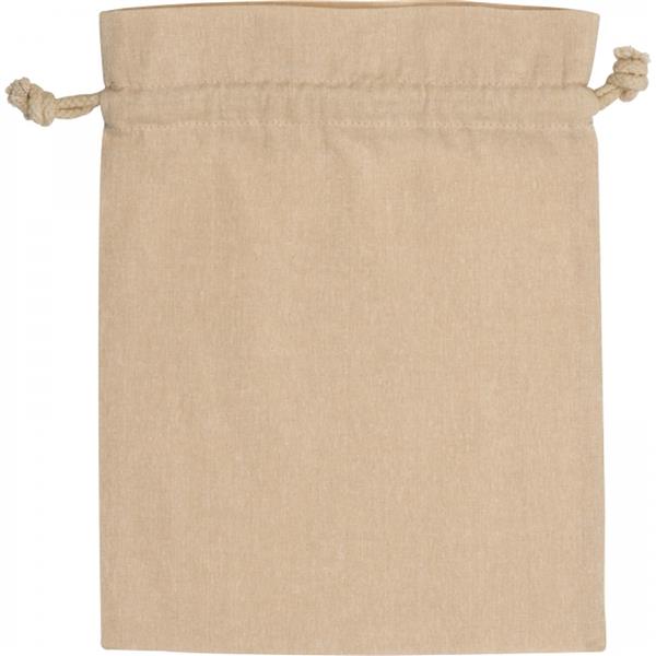 Woreczek bawełniany wykonany z bawełny pochodzącej z recyklingu, z certfikatem Oeko-Tex STANDARD 100, gramatura 110g/m2. Woreczek zamykany za pomocą sznureczków ściągających.