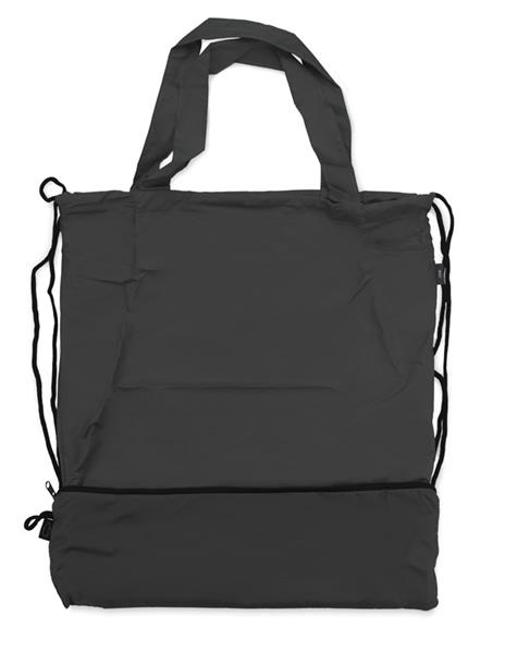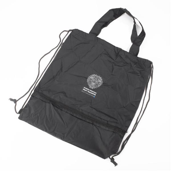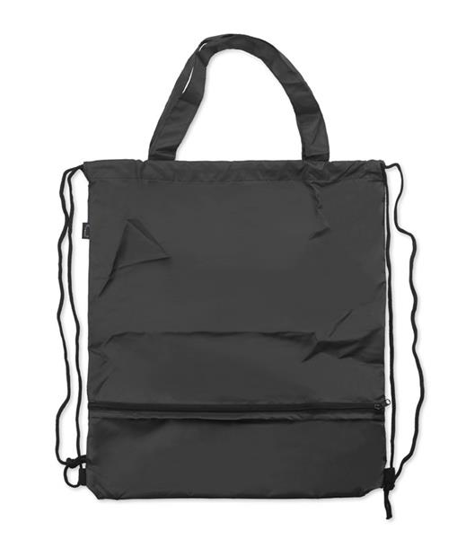 Worek na sznurkach z parasolem RAINY wykonany jest z poliestru RPET, co czyni go bardziej przyjaznym środowisku. Środek worka jest jednokomorowy. Oprócz tradycyjnych sznurków posiada jeszcze rączki o długości 44 cm, dzięki czemu może być używany także jako torba na zakupy. Na dole worka znajduje się zamykana na zamek kieszeń, w której schowany jest dołączony do zestawu parasol, także wykonany z poliestru RPET.