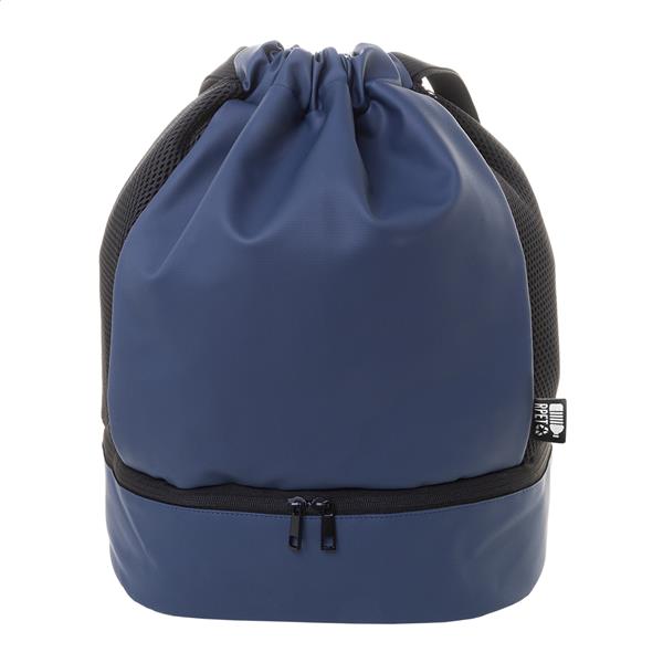 Worek ze ściągaczem RPET z przegrodą na buty zapinaną na suwak, siateczkowymi wstawkami bocznymi i szerokimi paskami. Poliester RPET 600D powlekany poliuretanem z charakterystyczną metką RPET.
