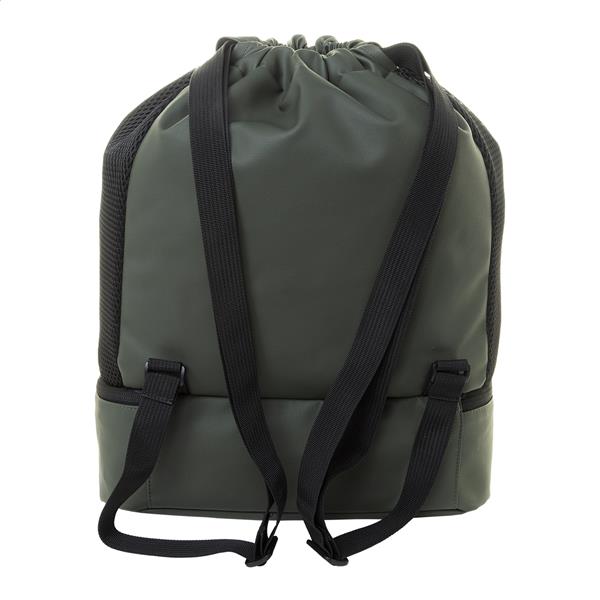 Worek ze ściągaczem RPET z przegrodą na buty zapinaną na suwak, siateczkowymi wstawkami bocznymi i szerokimi paskami. Poliester RPET 600D powlekany poliuretanem z charakterystyczną metką RPET.