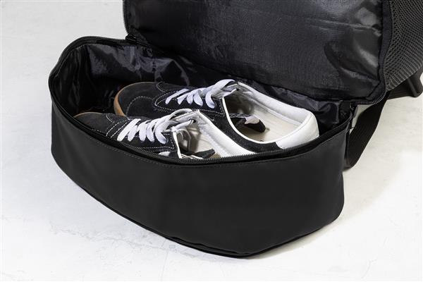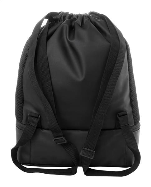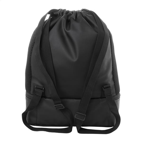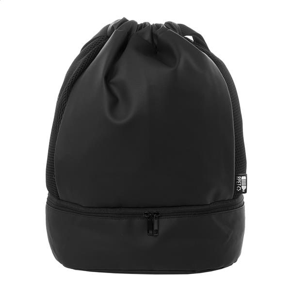 Worek ze ściągaczem RPET z przegrodą na buty zapinaną na suwak, siateczkowymi wstawkami bocznymi i szerokimi paskami. Poliester RPET 600D powlekany poliuretanem z charakterystyczną metką RPET.
