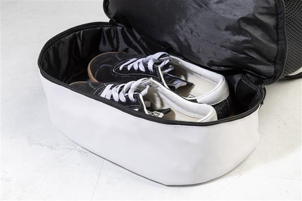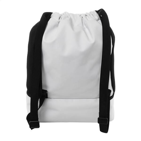 Worek ze ściągaczem RPET z przegrodą na buty zapinaną na suwak, siateczkowymi wstawkami bocznymi i szerokimi paskami. Poliester RPET 600D powlekany poliuretanem z charakterystyczną metką RPET.