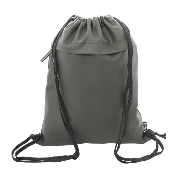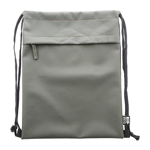 Worek ze ściągaczem RPET z przednią stroną powlekaną PU i kieszenią z przodu zapinaną na suwak. Poliester RPET 600D powlekany PU z charakterystyczną metką RPET.