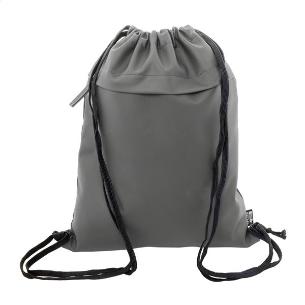 Worek ze ściągaczem RPET z przednią stroną powlekaną PU i kieszenią z przodu zapinaną na suwak. Poliester RPET 600D powlekany PU z charakterystyczną metką RPET.