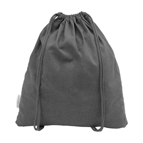 Worek ze sznurkami wykonany w 70% z bawełny z recyklingu i w 30% z poliestru RPET, o gramaturze 140 g/m2. Z charakterystyczną metką z bawełny z recyklingu.