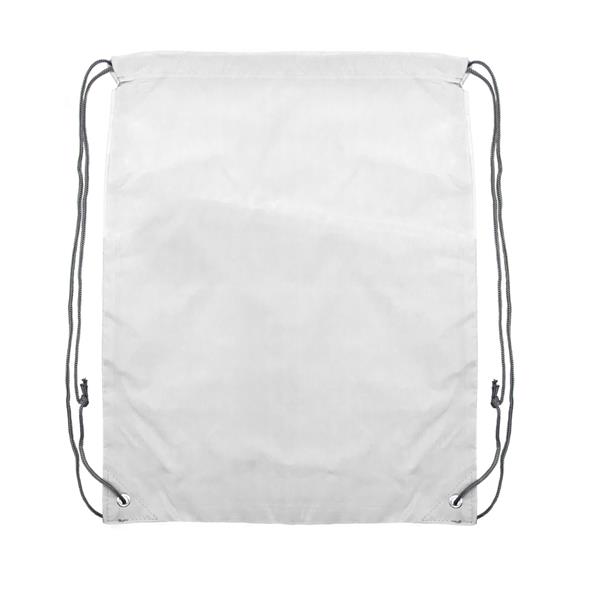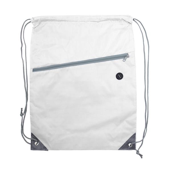 Worek ze sznurkiem umożliwiającym noszenie na plecach, wzmocnione narożniki zmniejszają ryzyko rozdarcia materiału, pomieści drobne zakupy lub strój sportowy na siłownię, posiada przednią kieszeń zamykaną na zamek błyskawiczny oraz otwór na kabel od słuchawek lub power banku (nie są dołączone), produkt wykonany z poliestru 210D