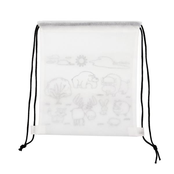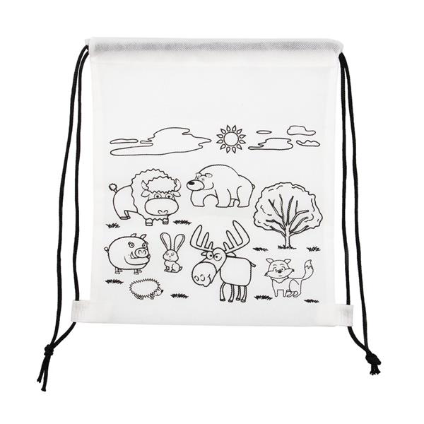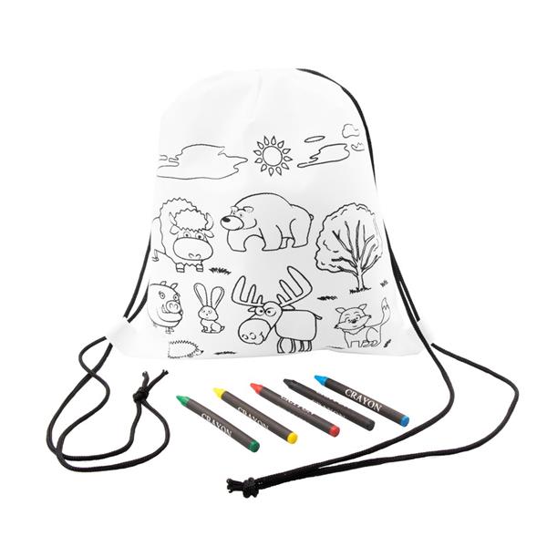 Worek ze sznurkiem umożliwiającym noszenie na plecach, kolorowanka z motywem zwierząt na froncie, 5 kredek świecowych w komplecie, produkt wykonany z materiału non-woven