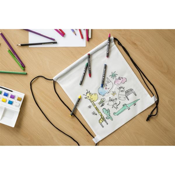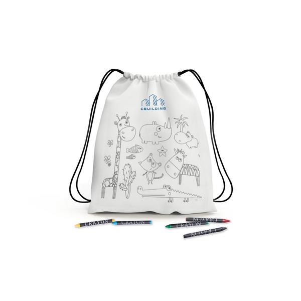 Worek ze sznurkiem umożliwiającym noszenie na plecach, kolorowanka z motywem zwierząt na froncie, 5 kredek świecowych w komplecie, produkt wykonany z materiału non-woven 80 g/m2
