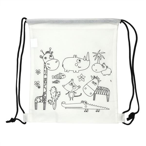 Worek ze sznurkiem umożliwiającym noszenie na plecach, kolorowanka z motywem zwierząt na froncie, 5 kredek świecowych w komplecie, produkt wykonany z materiału non-woven 80 g/m2
