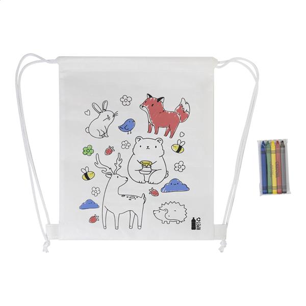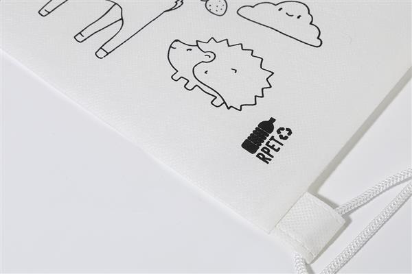 Worek ze sznurkami do kolorowania dla dzieci, wykonany z włókniny RPET, w zestawie 5 kredek. Primary Color: biały Rozmiar: 250×300 mm Rodzaj długopisy: Kredka Material 1: Włóknina z recyklingu PET