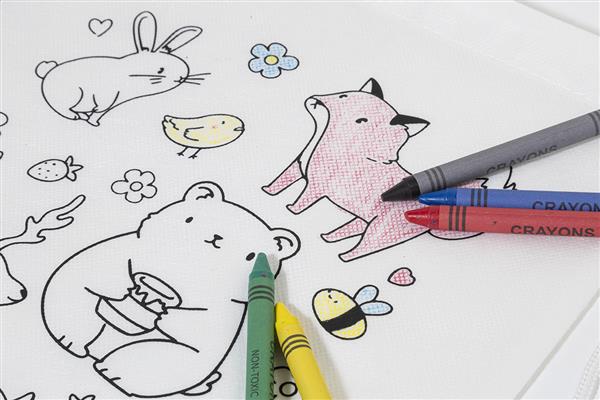 Worek ze sznurkami do kolorowania dla dzieci, wykonany z włókniny RPET, w zestawie 5 kredek.