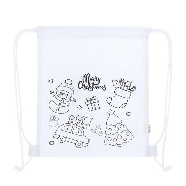 Worek ze sznurkiem umożliwiającym noszenie na plecach, kolorowanka z motywem świątecznym na froncie, 4 kredki świecowe w komplecie, ikona RPET na metce, produkt wykonany z materiału non-woven RPET