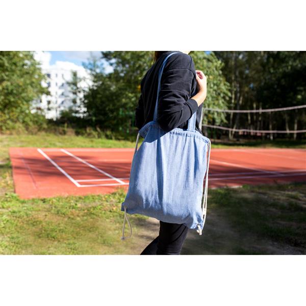 Worek ze sznurkiem i torba na zakupy 2 w 1, sznurki umożliwiają noszenie na plecach a długie uchwyty pozwalają nosić worek na ramieniu, pomieści drobne zakupy lub strój sportowy na siłownię, produkt wykonany z bawełny z recyklingu o gramaturze 140 g/m2
