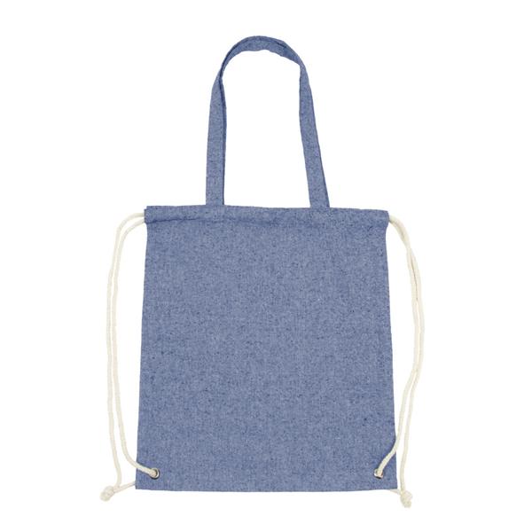 Worek ze sznurkiem i torba na zakupy 2 w 1, sznurki umożliwiają noszenie na plecach a długie uchwyty pozwalają nosić worek na ramieniu, pomieści drobne zakupy lub strój sportowy na siłownię, produkt wykonany z bawełny z recyklingu o gramaturze 140 g/m2