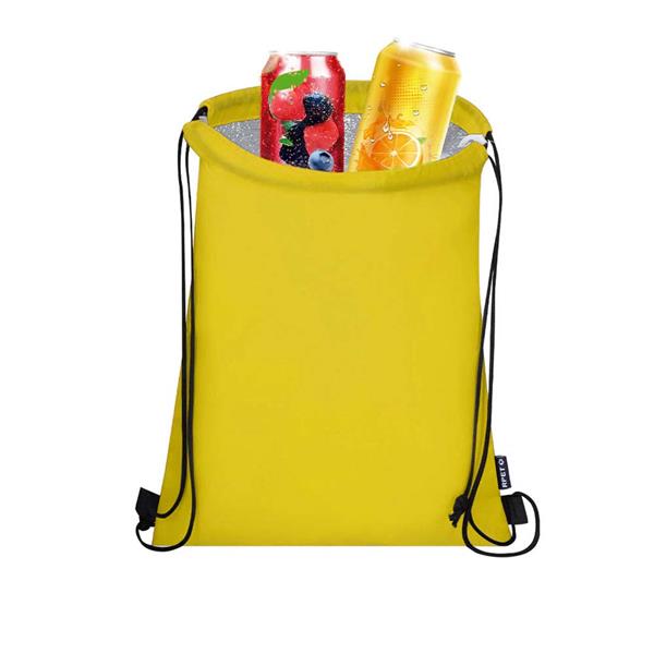 Worek ze sznurkiem umożliwiającym noszenie na plecach, pomieści drobne zakupy lub strój sportowy na siłownię, produkt wykonany z poliestru 210D RPET i aluminium