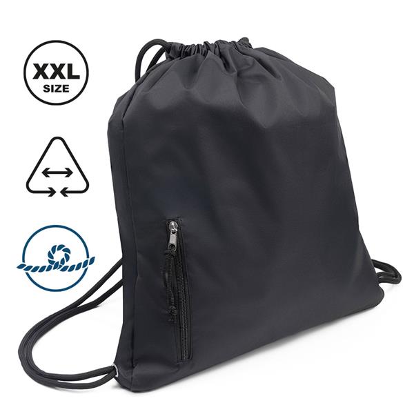 Obszerny worek z grubym sznurkiem umożliwiającym noszenie na plecach, wzmocniony wodoszczelny materiał lepiej chroni przed czynnikami atmosferycznymi, pomieści zakupy lub strój sportowy na siłownię, nowoczesny design, posiada funkcjonalną przednią kieszeń na drobiazgi zamykaną na zamek błyskawiczny, produkt wykonany z poliestru 230 g/m2