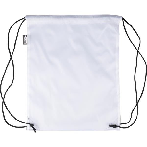 Worek ze sznurkiem, czarny nylonowy sznurek po obu stronach, zamknięcie na ściągacz, pojemność: 5L, maksymalne obciążenie: 7 kg, ikona RPET na metce, produkt wykonany z poliestru RPET 210D z dwoma czarnymi narożnikami z PU z przodu i wewnętrznymi szwami