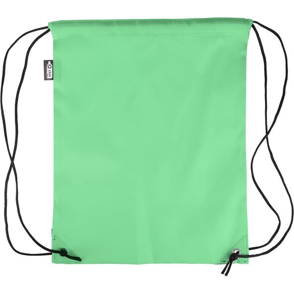 Worek ze sznurkiem, czarny nylonowy sznurek po obu stronach, zamknięcie na ściągacz, pojemność: 5L, maksymalne obciążenie: 7 kg, ikona RPET na metce, produkt wykonany z poliestru RPET 210D z dwoma czarnymi narożnikami z PU z przodu i wewnętrznymi szwami