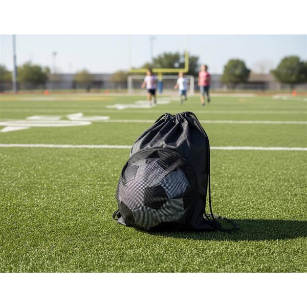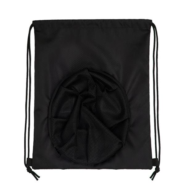 Worek ze sznurkiem, posiada zewnętrzną kieszeń z siatki na piłkę w rozmiarze 5, produkt wykonany z poliestru 300D o gramaturze 180 g/m2
