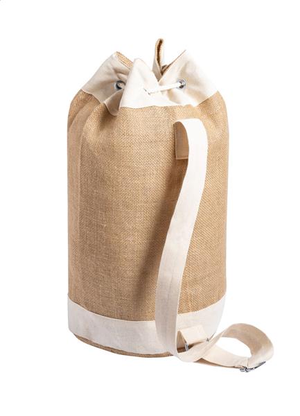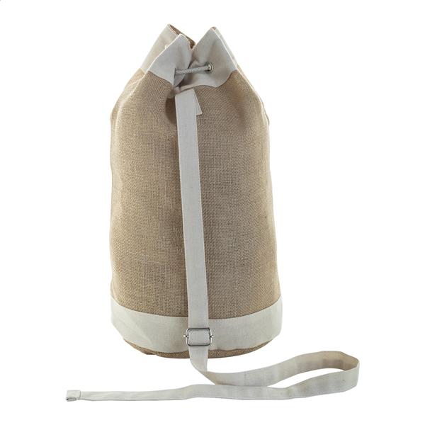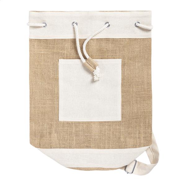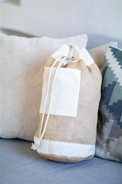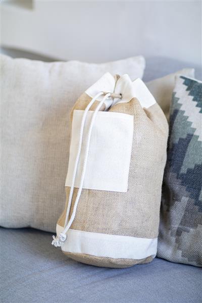 Marynarski worek z juty z bawełnianą kieszenią z przodu i zamknięciem sznurkowym.
