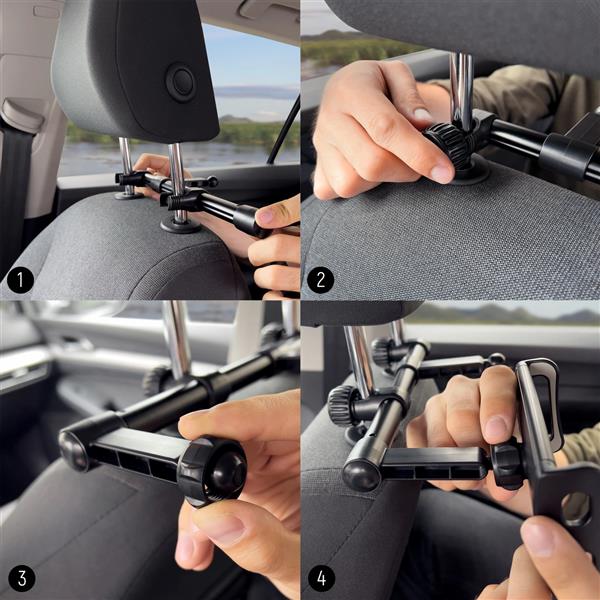 Aby zamontować uchwyt Wozinsky WTHBK1 w samochodzie, nie potrzebujesz żadnych narzędzi. Wystarczy, że odkręcisz gwintowane zakrętki, przytwierdzisz uchwyt do zagłówków i solidnie zakręcisz zakrętki. Gotowe!