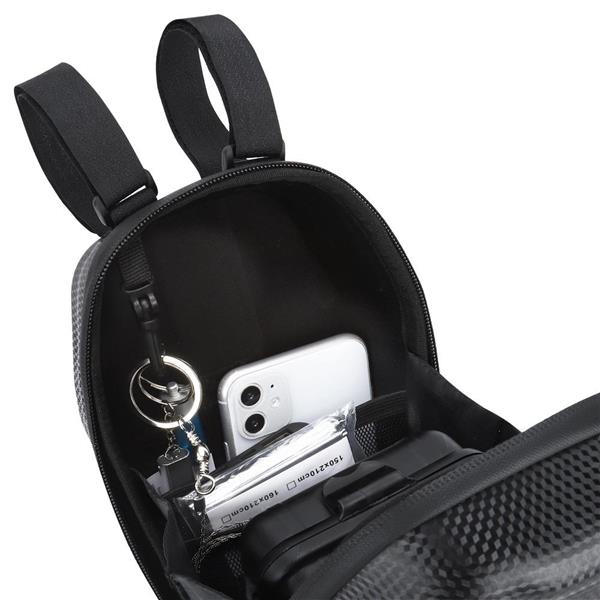 Torba na kierownicę hulajnogi Wozinsky WSB4BK to estetycznie i solidnie wykonany gadżet, który pozwoli Ci zabrać ze sobą wiele przydatnych przedmiotów: portfel, telefon, klucze do mieszkania czy nawet malutką butelkę wody. Wszystkie akcesoria będą przy tym bezpieczne. Torba została wykonana z mocnego tworzywa EVA, odpornego na wodę, zabrudzenia i kurz. Stabilnie trzyma się kierownicy nawet na nierównych drogach. Do hulajnogi przymocowuje się ją za pomocą czterech trwałych rzepów.