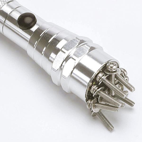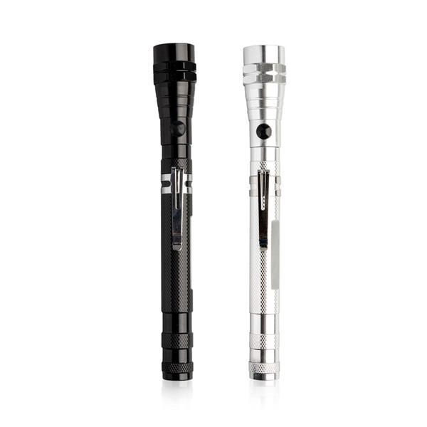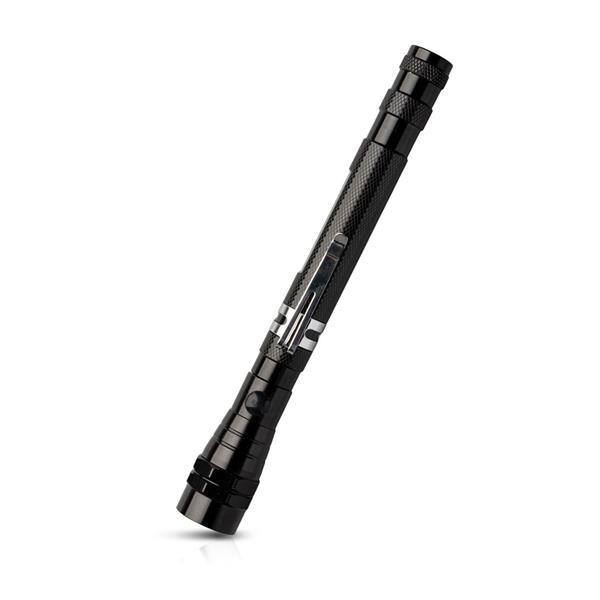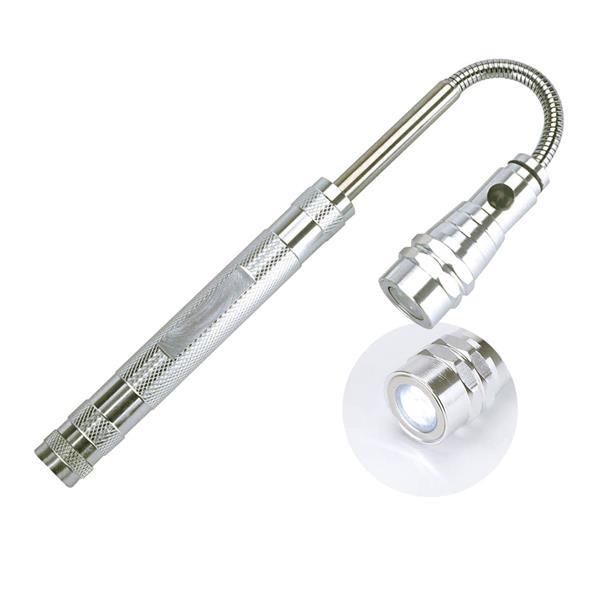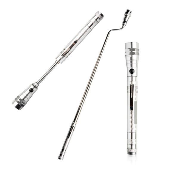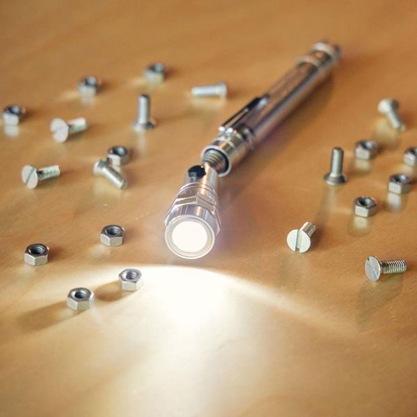 Wysuwana latarka aluminiowa z dwiema magnetycznymi krawędziami. Ta przydatna i bardzo praktyczna latarka jest jeszcze bardziej wszechstronna dzięki możliwości przdłużania. Posiada również elastyczną końcówkę, co pozwala na skierowanie światła led w dowolnym kierunku. Dwie krawędzie latarki są magnetyczne i umożliwiają chwytanie małych metalowych przedmiotów. Działa na 4 baterie LR44 (już w zestawie).
