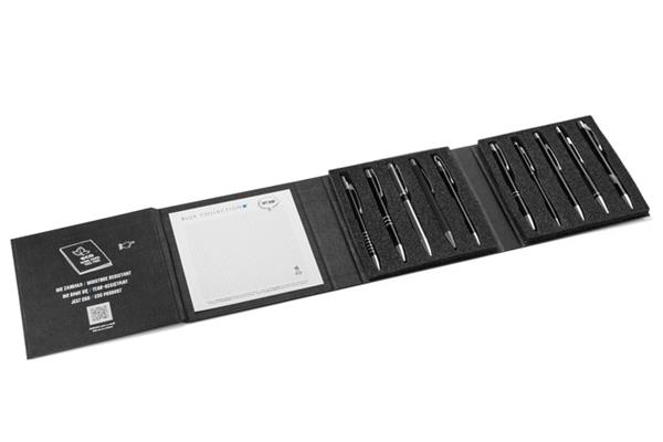 Nowoczesny i elegancki wzornik mieszczący 10 najpopularniejszych metalowych długopisów z oferty Blue Collection. Staranne wykonanie zrobi wrażenie na każdym, który go otrzyma. Będzie idealnym materiałem do prezentacji, dzięki umieszczonemu wewnątrz notesowi z papieru kamiennego da możliwość jednoczesnego przetestowania długopisów.
