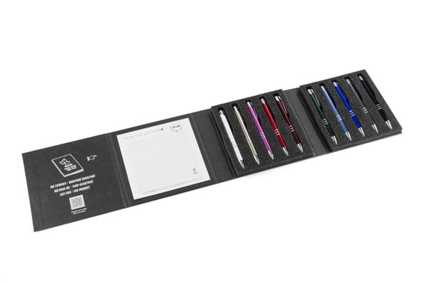 Nowoczesny i elegancki wzornik mieszczący 10 najpopularniejszych metalowych długopisów z oferty Blue Collection. Staranne wykonanie zrobi wrażenie na każdym, który go otrzyma. Będzie idealnym materiałem do prezentacji, dzięki umieszczonemu wewnątrz notesowi z papieru kamiennego da możliwość jednoczesnego przetestowania długopisów.