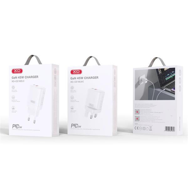 XO CE16 to zaawansowana ładowarka sieciowa 45W wyposażona w gniazdo USB-C oraz gniazdo USB. Zapewnia wystarczającą ilość energii do szybkiego ładowania nawet największych dostępnych urządzeń mobilnych. Klasyczny wygląd pasuje do wszystkich rodzajów wnętrz a jakość wykonania wskazuje, że jest to urządzenie solidne i trwałe.
