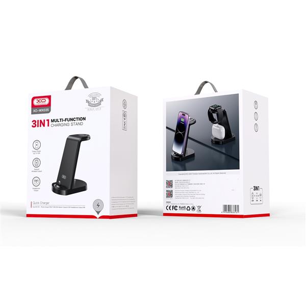 XO WX035 3w1 to podstawka ze złączami Lightning do ładowania smartfonów i słuchawek bluetooth z dodatkową ładowarką indukcyjna kompatybilną z zegarkami Apple Watch. To sprawia, że doskonale sprawdza się w domu lub w biurze.