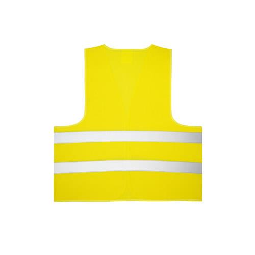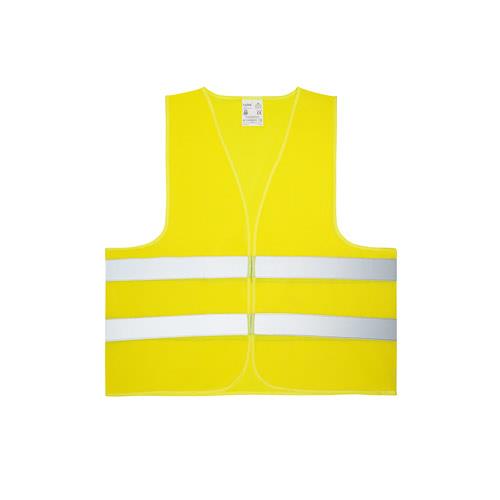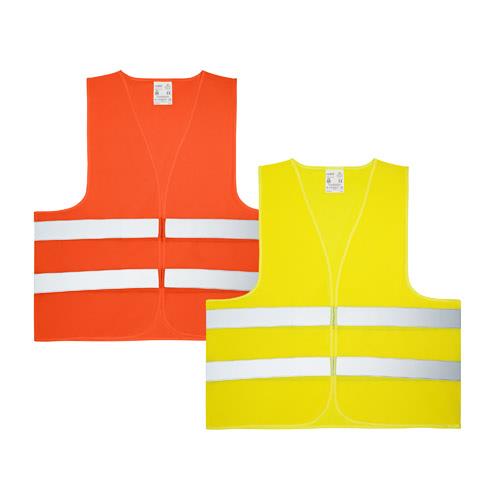 Kamizelka odblaskowa, 100% poliester, z certyfikatem EN ISO 20471 klasa 2. Z dwoma poziomymi pasami odblaskowymi i przylegającym zapięciem z przodu. Jeden rozmiar: 670 x 700 mm