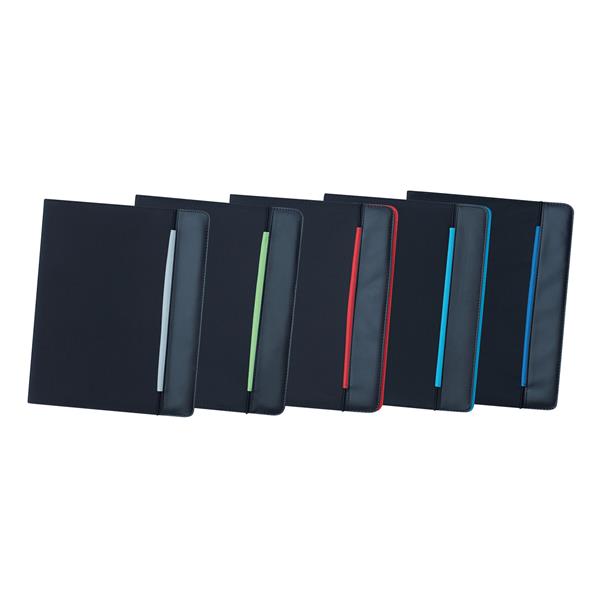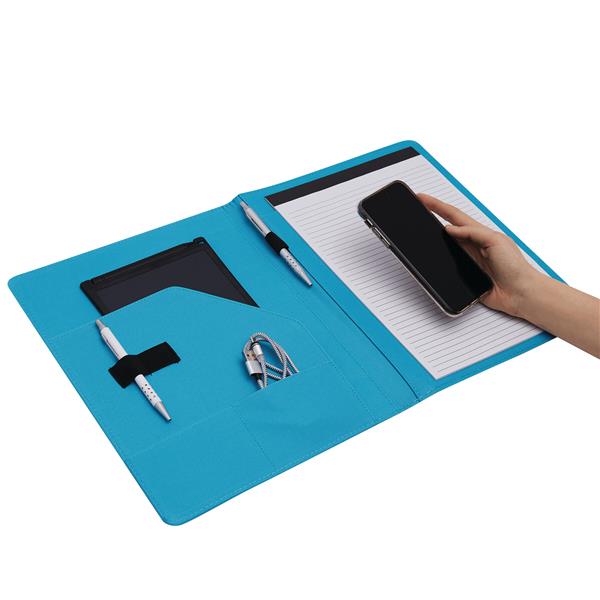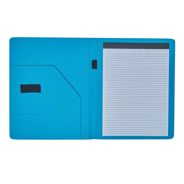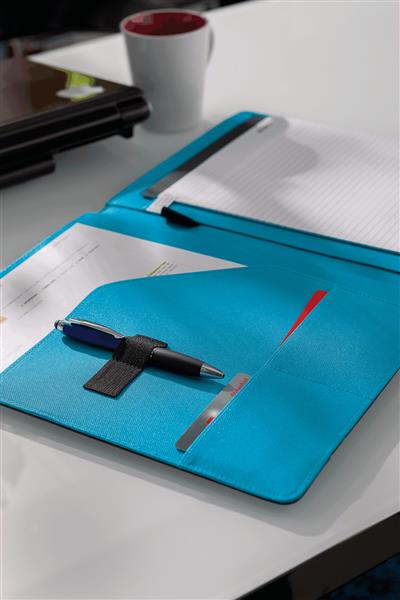Portfolio YOUNG STAR w formacie A4, z notesem, wsuwanymi kieszonkami, pętelkami na długopis i inne akcesoria, zamykane gumką, na zewnątrz czarne, w środku kolorowe. Materiał: Poliester Kolor: czarny, turkusowy Tagi: Teczki,teczki,teczki,akcesoria biurowe,torby