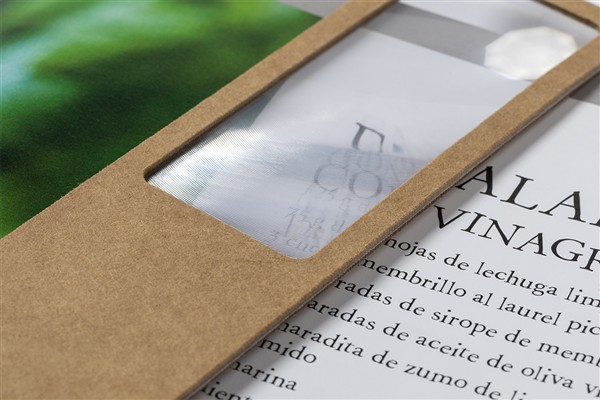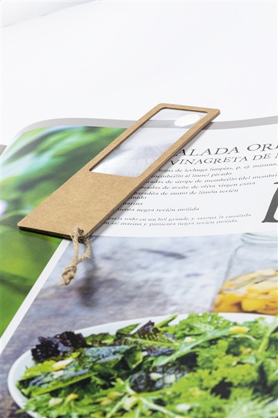 Zakładka do książek wykonana z papieru z recyklingu, ze szkłem powiększającym i sznurkiem.