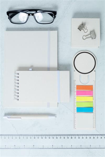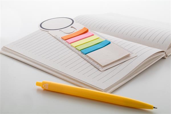 Zakładka i linijka z kartonu po mleku z recyklingu, zawierająca 15 karteczek samoprzylepnych i 75 znaczników stron (w 5 różnych kolorach).