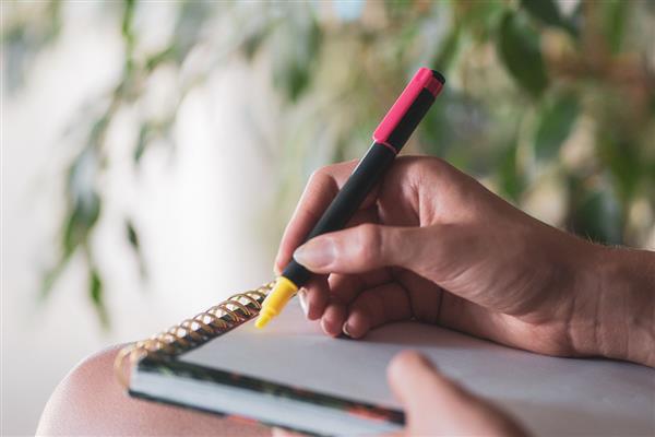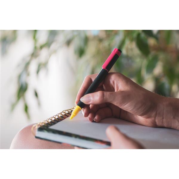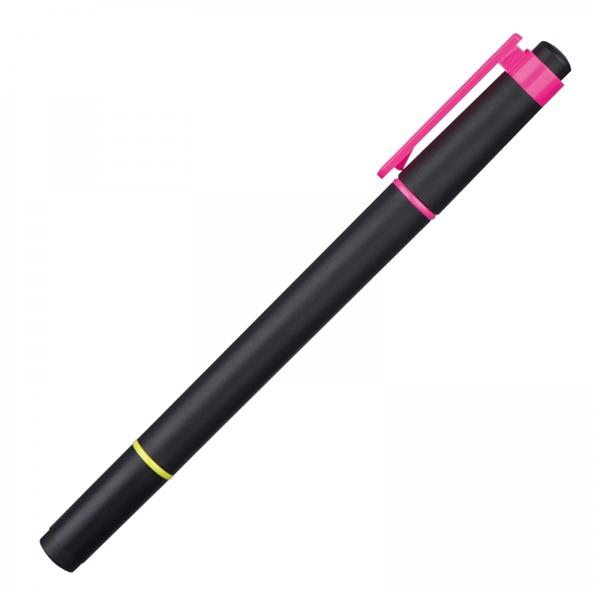 Plastikowy dwustronny zakreślacz w dwóch neonowych kolorach – różowym i żółtym.
