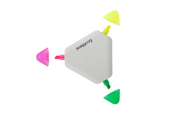 Zakreślacz w kształcie trójkąta w 3 kolorach z tworzywa sztucznego pochodzącego z recyklingu EcoAllene®. EcoAllene® to nowy i innowacyjny materiał pochodzący z recyklingu kartonów po napojach.