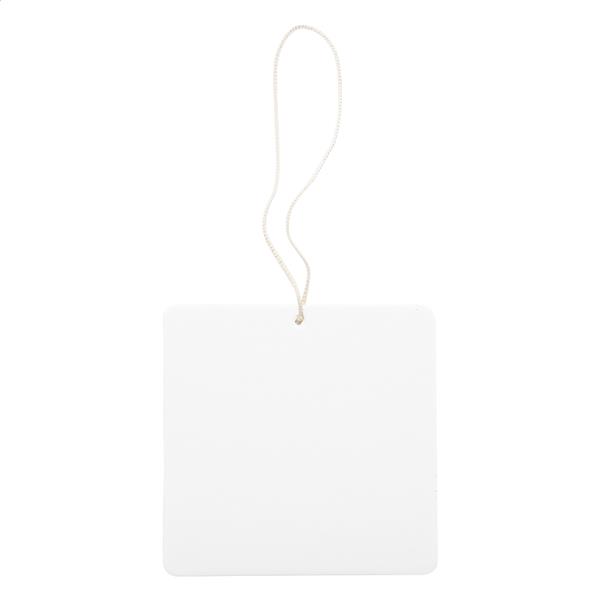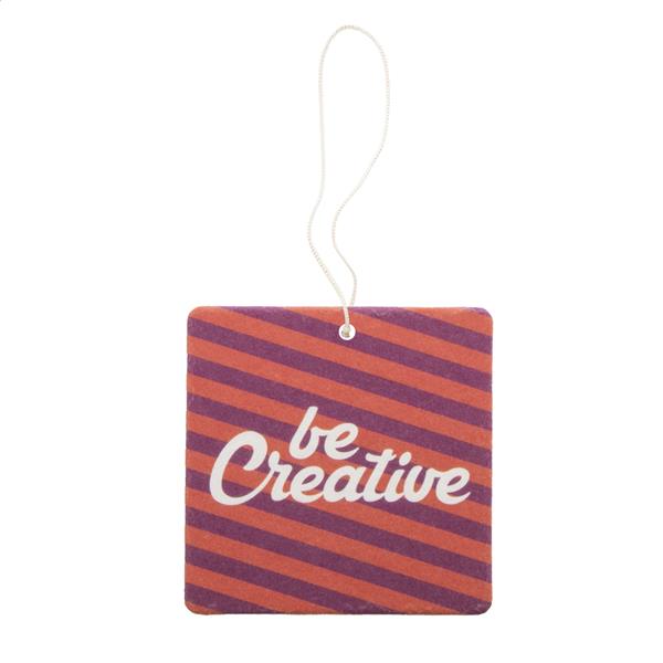 Personalizowany zapach do samochodu o indywidualnym kształcie i zapachu (egzotyczny, zielone jabłko, cytryna, nowy samochód, ocean, wanilia, luksus, mentol). Znakowanie do 4 kolorów CMYK po obu stronach. Min. ilość. 250 sztuk.