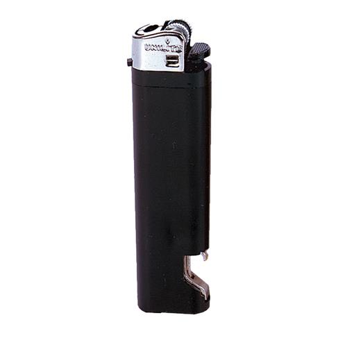 Plastikowa zapalniczka jednorazowa z otwieraczem do butelek. Rozmiar: 2,3 x 8,9 cm T1 (tampodruk): 4 x 1,4 DC0 (długopisy, zapalniczki): 4 x 1,4 Kolor: Czarny