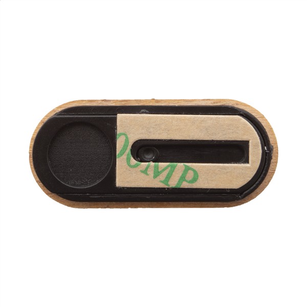 Samoprzylepna, przesuwana zaślepka na kamerę internetową z drewnianą powierzchnią.