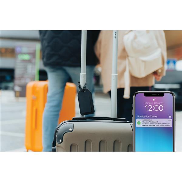 Zawieszka bagażowa, wykrywacz, lokalizator, produkt wykonany z poliestru pochodzącego z recyklingu RCS, po pełnym naładowaniu produkt działa ok. 6 miesięcy, całkowita zawartość materiałów z recyklingu 9% w oparciu o całkowitą wagę produktu, certyfikat RCS zapewnia w pełni certyfikowany łańcuch dostaw materiałów pochodzących z recyklingu, zapakowany w opakowanie prezentowe FSC® mix